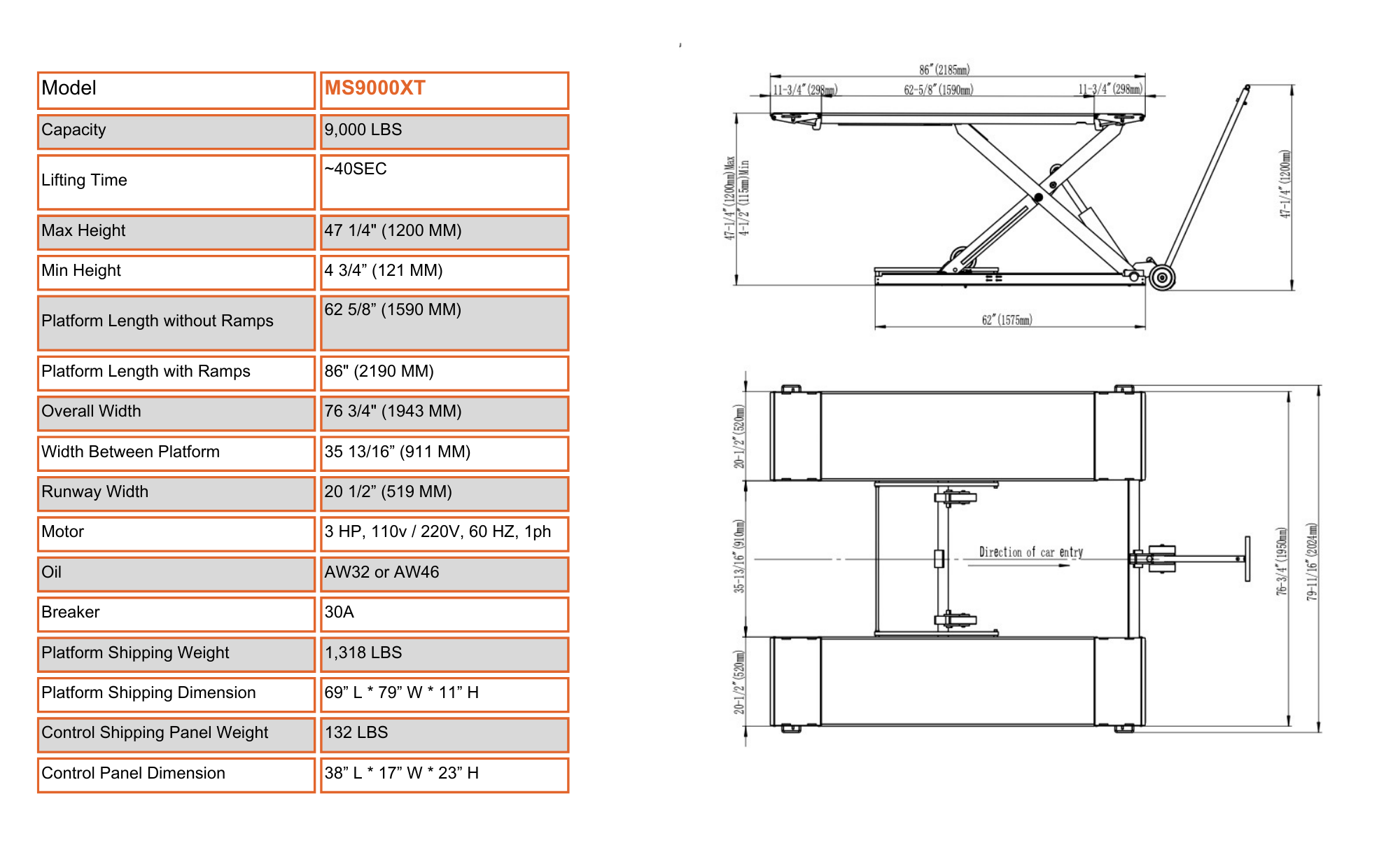 Introducing Stratus SAE-MS9000XT - the perfect choice for any commercial garage. This mid rise scissor lift is specifically engineered with the user in mind. It's extra wide and extra tall, standing proudly at 47 1/4", ensuring you can work on a massive range of vehicles with room to spare. Its 9000 lbs capacity makes lifting heavy vehicles a breeze, and the electric safety lock release guarantees your work is carried out securely. Experience a new approach to car lifting with this top-of-the-line model.